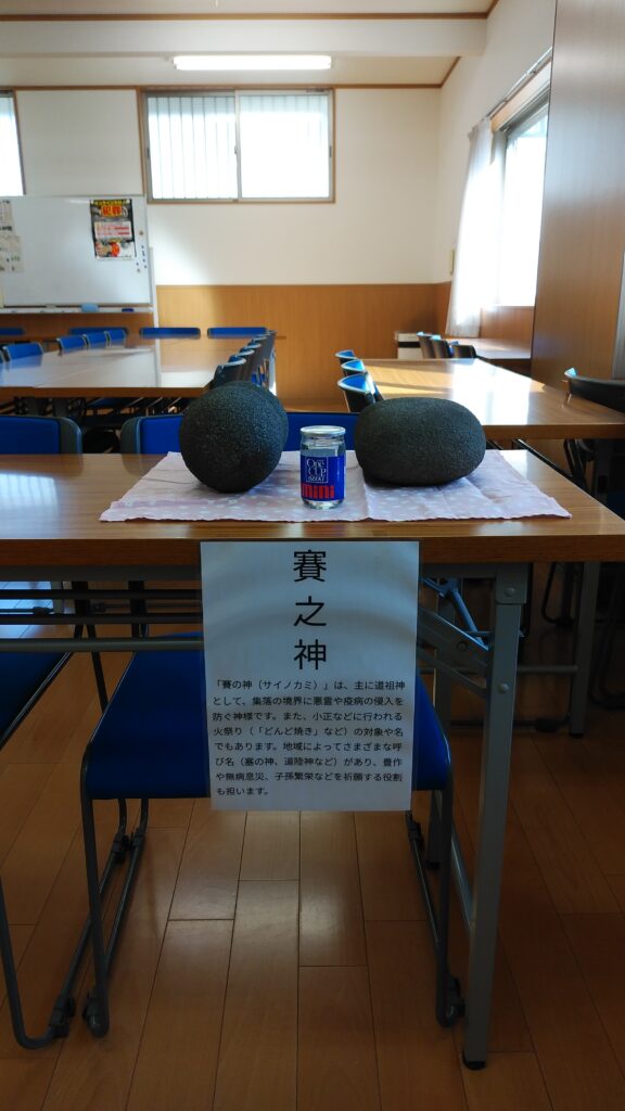 「賽之神」は、主に道祖神として、集落の境界に悪霊や疫病の侵入を防ぐ神様です。また、小正月などに行われる火祭り(「どんど焼き」など)の対象や名でもあります。地域によってさまざまな呼び名(塞の神、道陸神など)があり、豊作や無病息災、子孫繁栄などを祈願する役割も担います。