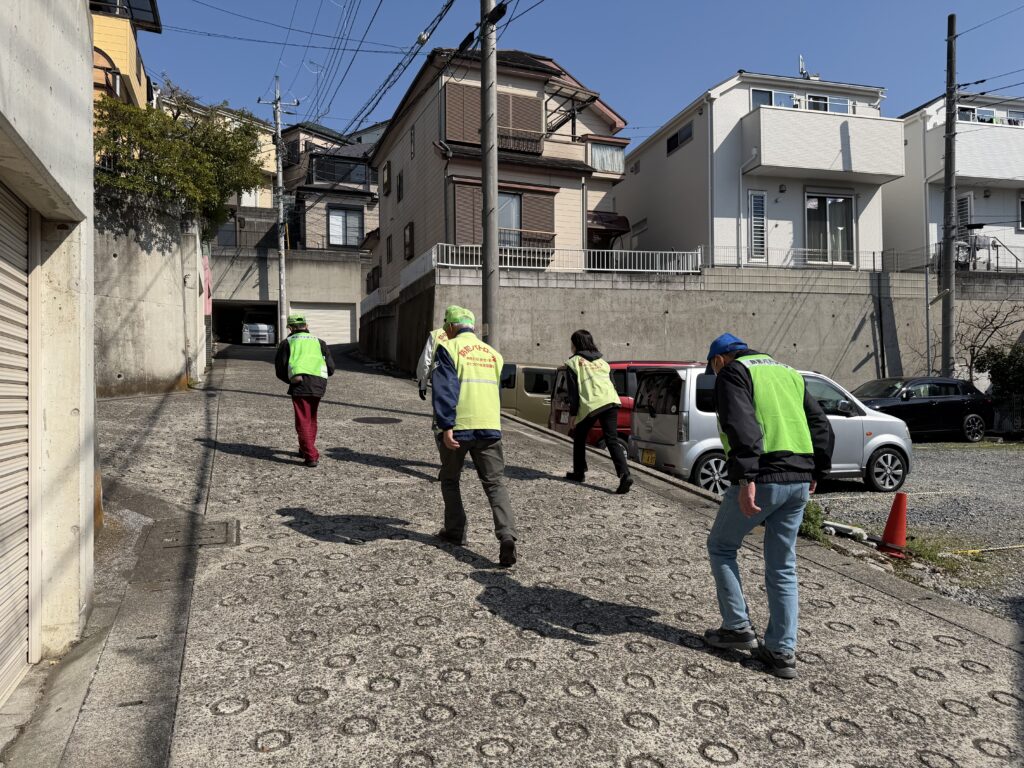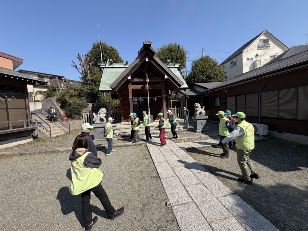 今回は組長さんを含め、14名の方にご参加いただき、地域を巡回いたしました。今日は穏やかな天候に恵まれ、神社周辺や住宅街、通学路などを確認しながら、地域の安全を見守る活動を行いました。