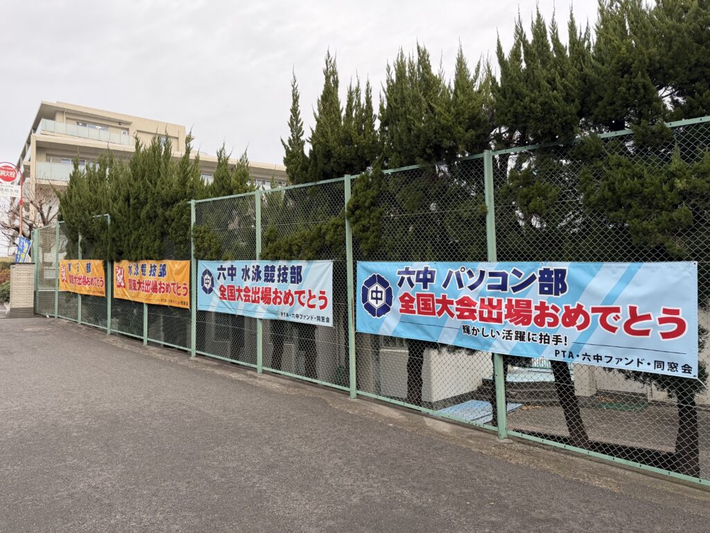 六角橋中学校では、部活動で全国大会に出場した生徒たちを応援する横断幕が掲示されています。
