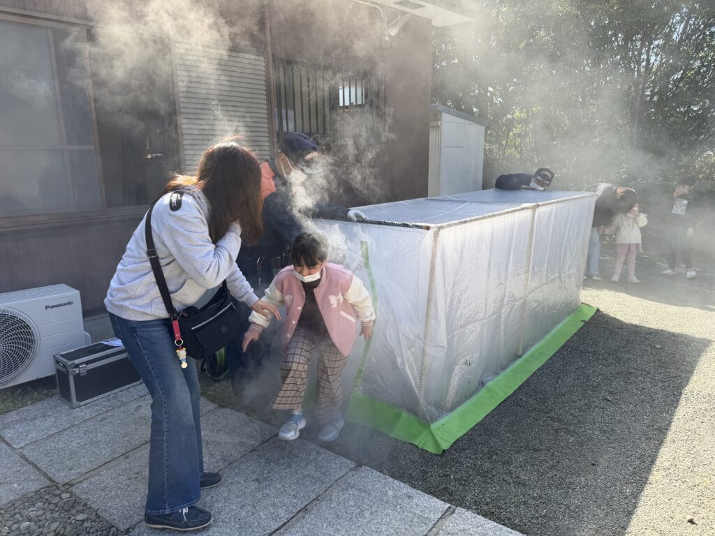 煙体験では、煙が充満したテントの中を通り抜ける体験を行いました。